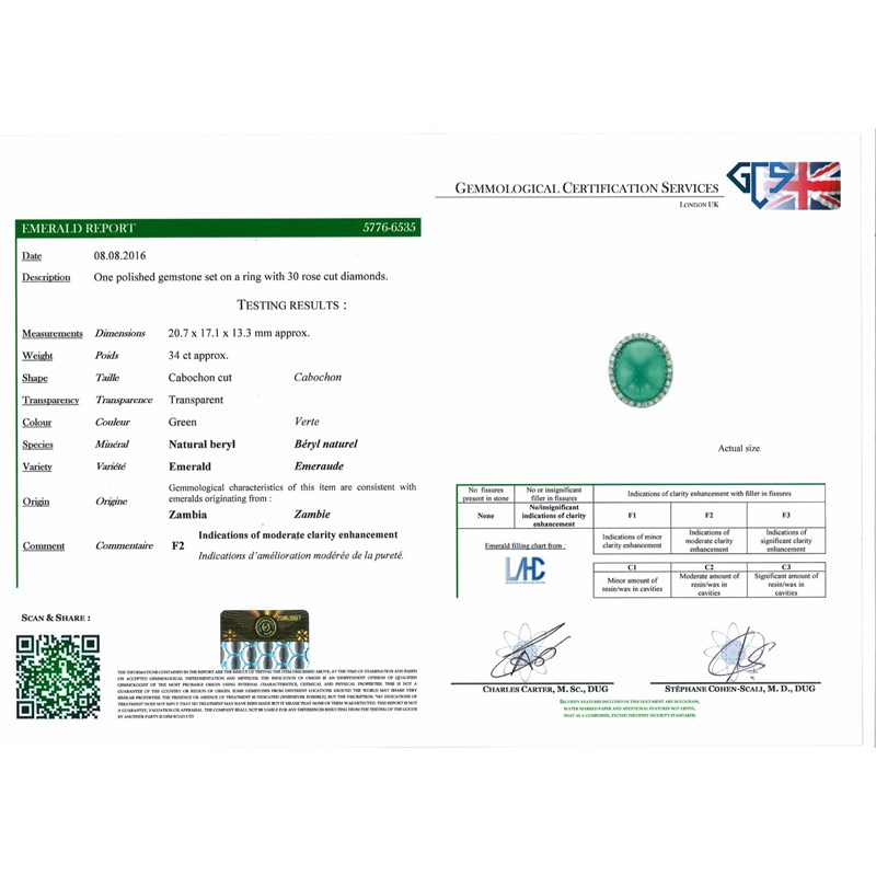 Accompanied by report number 5776-6535 dated 8th August 2016 from GCS, London stating that the cabochon cut emerald weighs approximately 34.00cts and is a natural emerald with moderate clarity enhancement. Origin: Zambia.