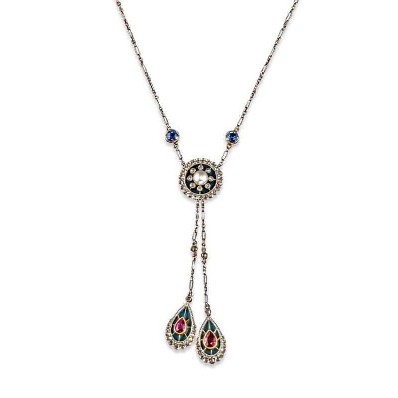 An early 20th century gem-set and enamel lavalier, the central plaque set with plique-a-jour enamel and a pearl and diamond, suspending two drops, each with a central ruby within plique-a-jour enamel and diamond surround. The fine link neck chain with two sapphires. The chain 38cm.