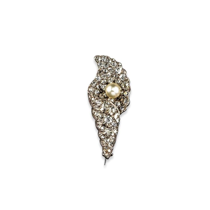 An Edwardian shell brooch, realistically designed as a Babylon Turrid shell, set overall with graduated old cushion-shaped diamonds and an untested pearl, in platinum. 4.3cm long. Fitted case by Thomas Woolley Ltd.