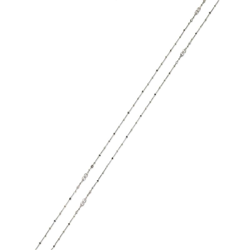 A diamond and gem-set long guard chain, alternately-set with diamonds , seed pearls and black diamonds with millegrain-set lemniscates in platinum. 136cm long.