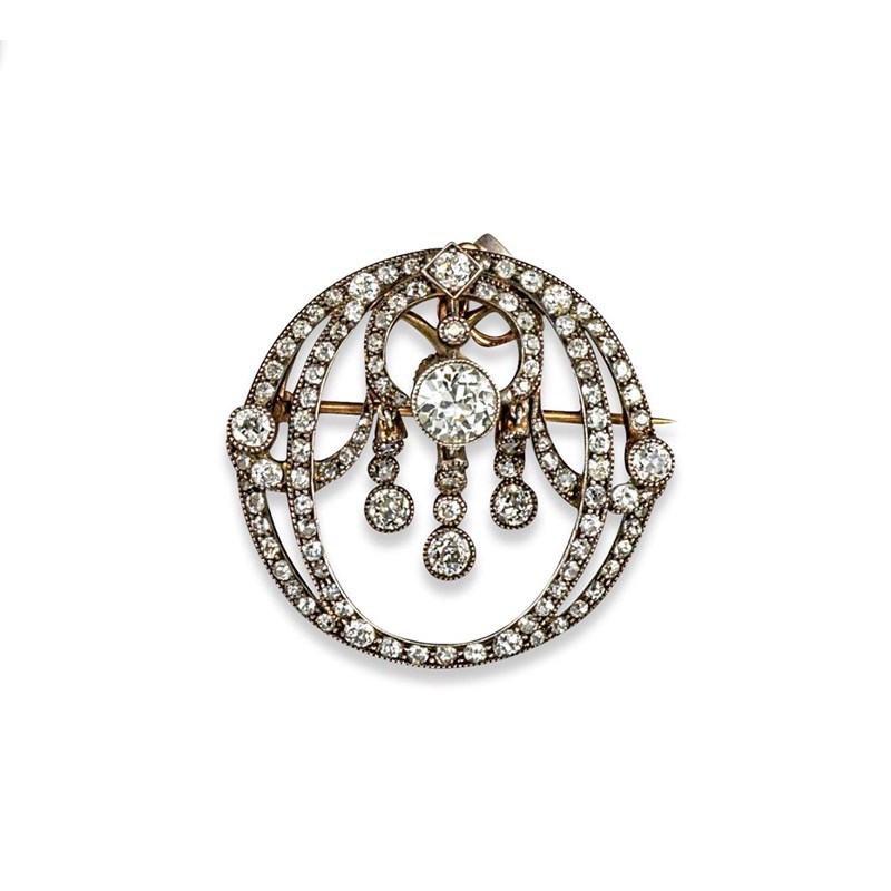 A Victorian diamond brooch/pendant, of circular form, set with a central circular-cut diamond within scroll borders of smaller diamonds and suspending three articulated lines of diamonds, millegrain-set in silver and gold. With detachable diamond-set bale. 3.2cm wide.