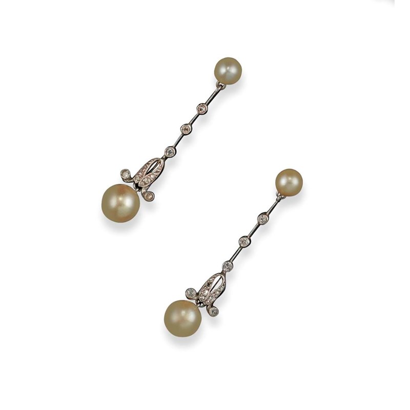 A pair of early 20th century pearl and diamond drop earrings, the pearl studs suspend a detachable and articulated knife-edge line of diamonds and a larger natural pearl. In Boucheron box.