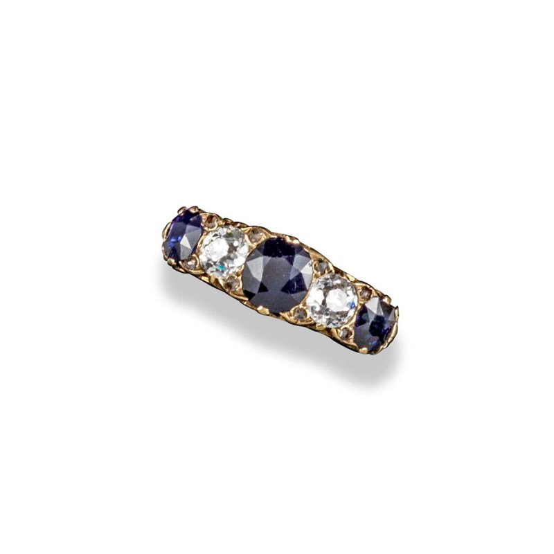 A sapphire and diamond five stone ring, set with oval-shaped sapphires and cushion-shaped diamonds in carved and pierced yellow gold shank. With an inscription dated 1898 to the inner shank. Size O 1/2. Case by Carrington & Co.