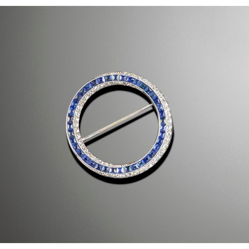 A sapphire and diamond circular brooch, designed as eccentric circles of calibre-cut sapphires and cushion-shaped diamonds millegrain-set in platinum. 2.5cm diameter.