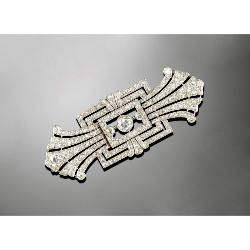 An Art Deco diamond brooch, of geometric design and set with a central old circular-cut diamond within concentric rectangular borders and stylised fleur-de-lys terminals in platinum. 8cm wide.