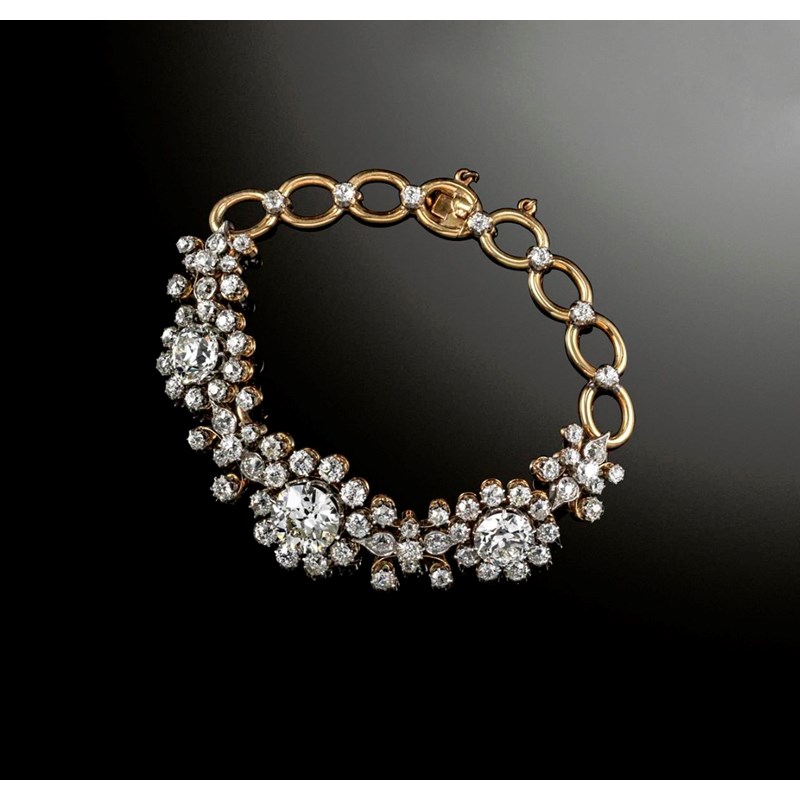 A late Victorian diamond bracelet, designed as three graduated diamond clusters, each joined with diamond set scrolls in gold. The three principal transitional circular-cut diamonds weigh approximately 2.80, 2.01, and 1.85cts. The open curb-link back section set with small diamonds. 16cm. Fitted blue leather case with gold embossed initals MB.