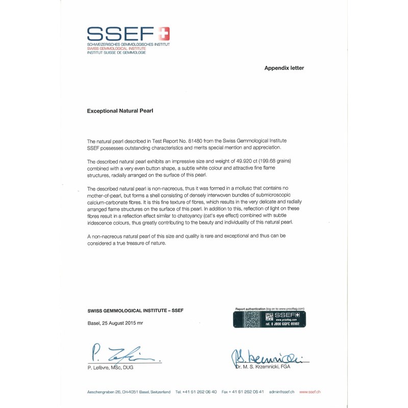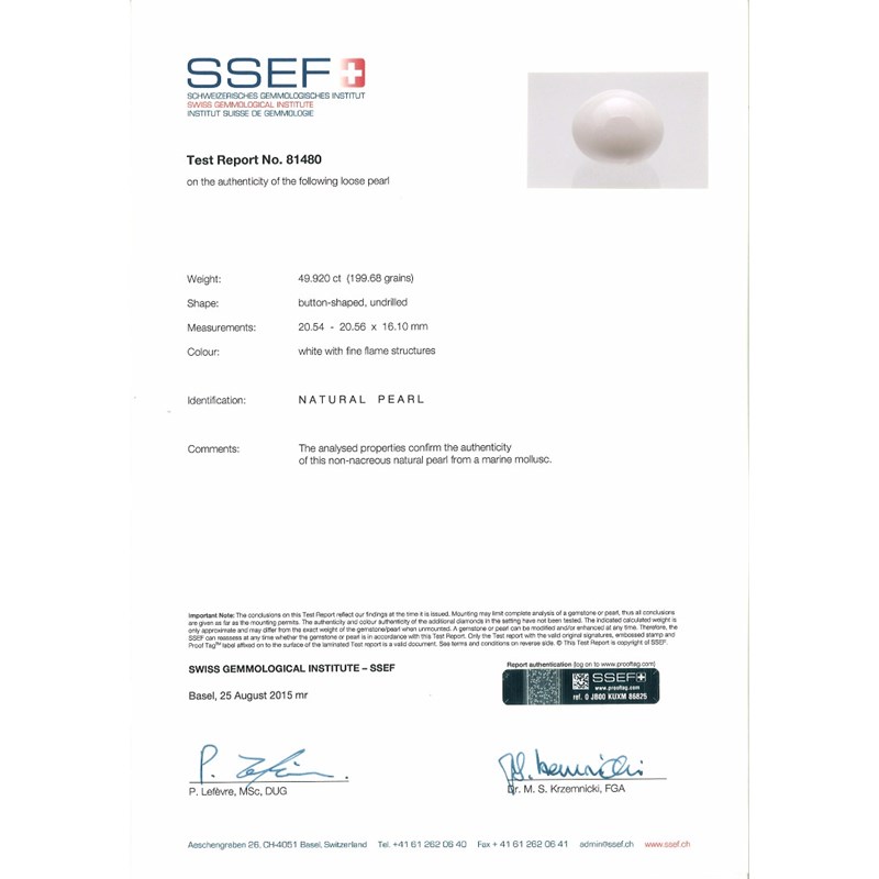Accompanied by hard-bound report numbered 81480 and dated 25th August 2015 from SSEF, Switzerland stating that the button-shaped undrilled pearl weighs 49.920cts (199.68 grains) is white with fine flame structures and is a non-nacreous natural pearl.
