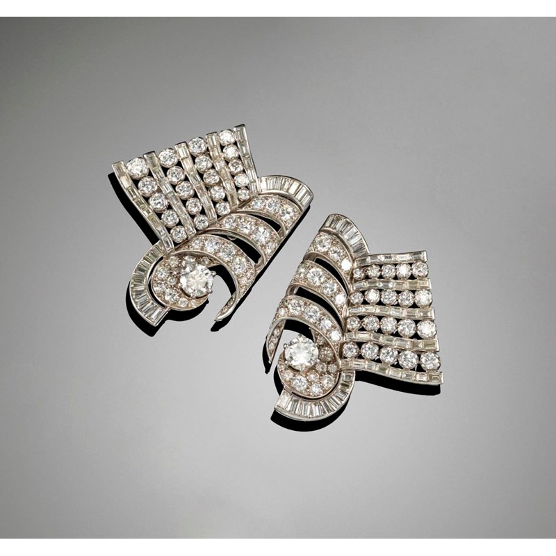 An Art Deco diamond double clip brooch, of geometric scroll design and set with graduated circular-cut and baguette-shaped diamonds in platinum. Separating to be worn as two matching clips. 7.2cm wide (together)