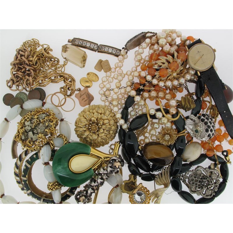 A gold necklace, two damaged gold bracelets, three gold wedding rings, two pairs of gold cuff links, a gold pendant (approximately 98g total). A large emerald cut citrine, and costume jewellery.