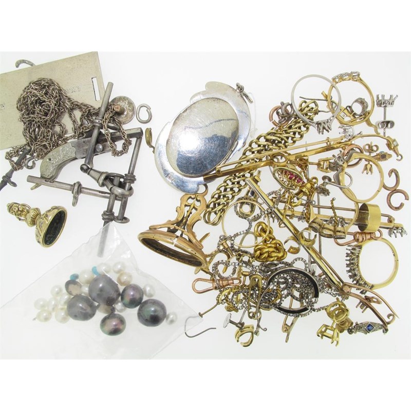 Various items of gold, findings, scrapping jewellery etc, approximately 100g in total. Cultured pearls, a miniature cap pistol (working) etc.
