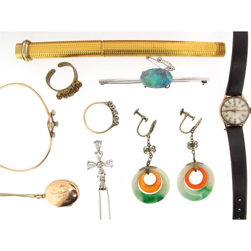A solid black opal mounted white gold bar brooch. A cased Must-de-Cartier ball point pen. And assorted items of jewellery and costume jewellery.
