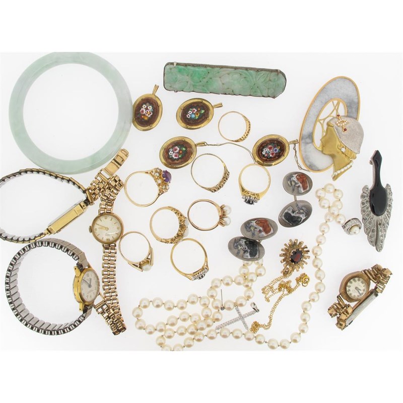 A sapphire and diamond cluster ring. Another sapphire and diamond cluster ring, an opal set gold ring, a diamond set white gold cross pendant, four wristwatches, a bangle, a large gold mounted brooch designed as a ladies head by a window, and various items of jewellery etc.