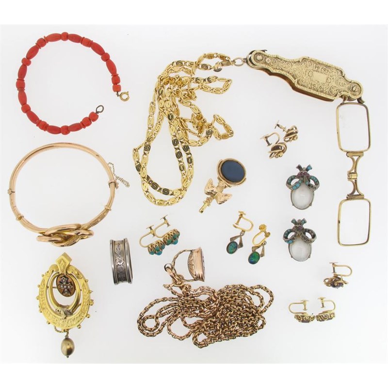 A gold long guard chain. 124cm long. Approximately 21g. With a carnelian mounted fob seal. A Victorian gold lovers knot bangle. Approximately 12g. A Victorian gold brooch pendant. A pair of amethyst earrings and gold earrings. A pair of turquoise cluster gold earrings. A pair of gold knot earrings. A falcon mounted swivel fob seal. A coral bead bracelet. A pair of lorgnette and other items of jewellery.