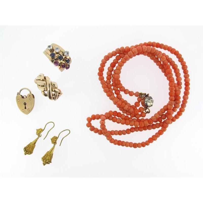A two row coral bead necklace, a pair of Etruscan style gold drop earrings, a gold puzzle ring, a stone set five section gold ring and a gold padlock clasp.