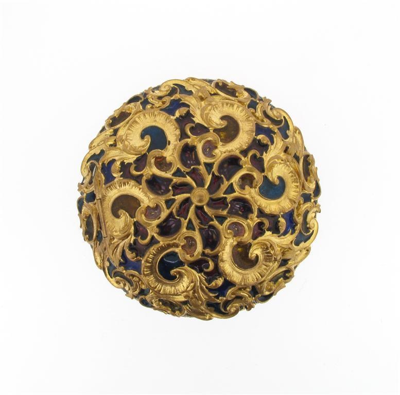 A circular gilt metal covered box. With scrolling plique-a-jour enamel decoration. 5.5cm wide.