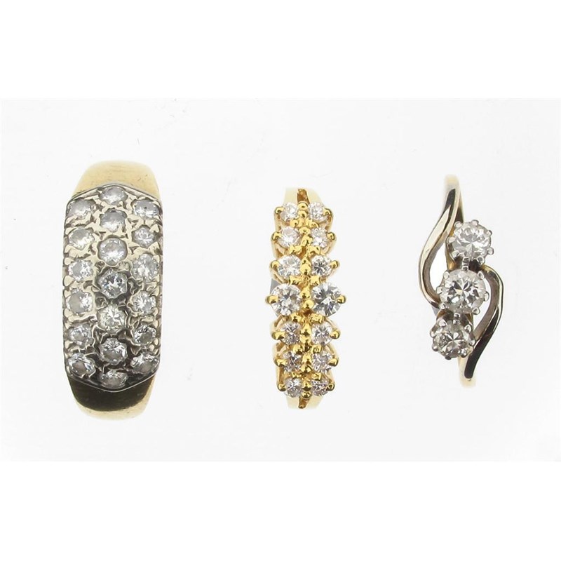 A diamond three stone ring set in gold. Size M. A fourteen stone diamond ring set in yellow gold. Size M. And a diamond cluster ring set in 18ct gold. Size V 1/2.