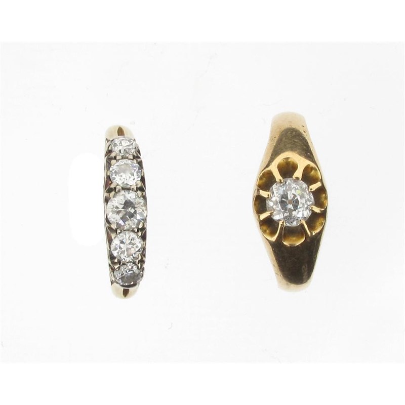 A diamond solitaire ring. Set in gold. Size N 1/2. And a diamond five stone ring