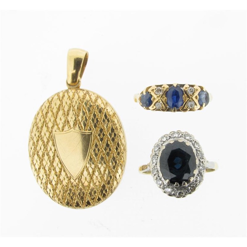 A sapphire and diamond cluster ring, in gold. Size Q. A blue stone and diamond half hoop ring in gold. And a gold locket pendant (14g).