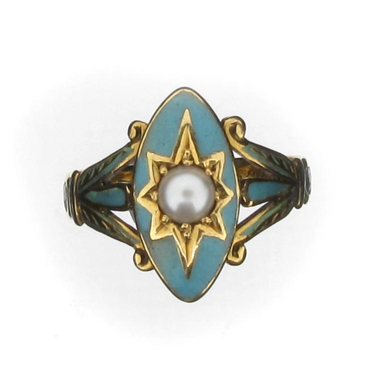 A 15ct gold ring. With blue enamel decoration and centred with a pearl. Chester marks for 1909.