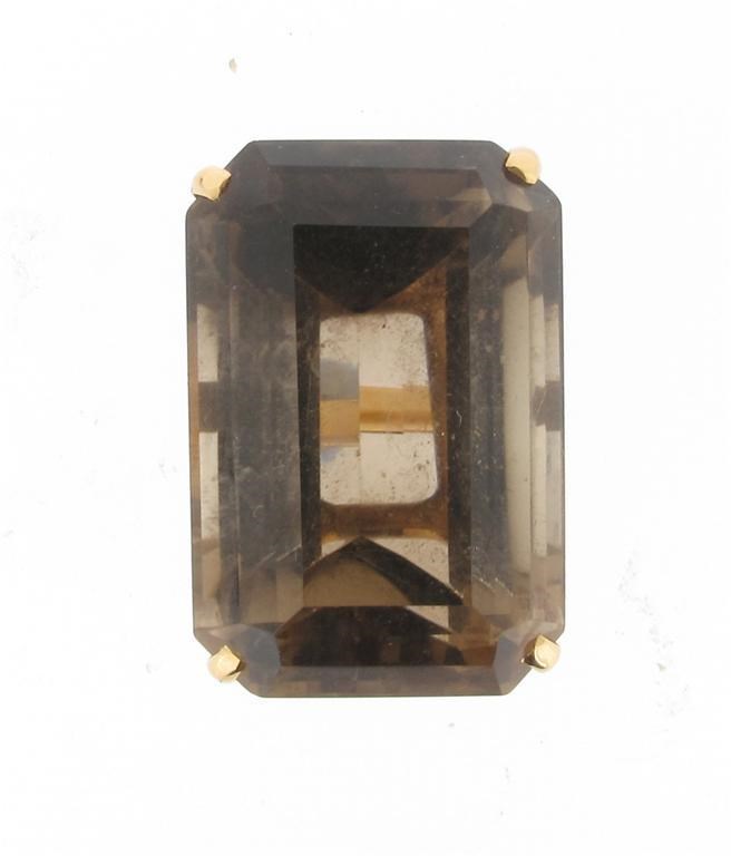 A large emerald cut smokey quartz mounted gold ring. Size O 1/2.