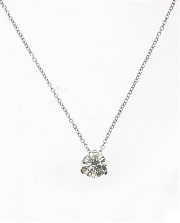 A diamond pendant. The brilliant cut diamond weighs approximately 0.90 carats and is set in white...