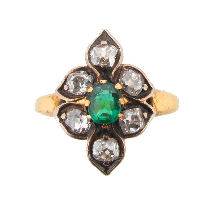 A green stone and diamond ring. Set in silver and gold. Size J.