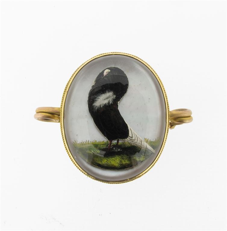 A late 19th Century gold brooch mounted with a reverse carved oval crystal painted with a fancy pigeon. 3cm high.