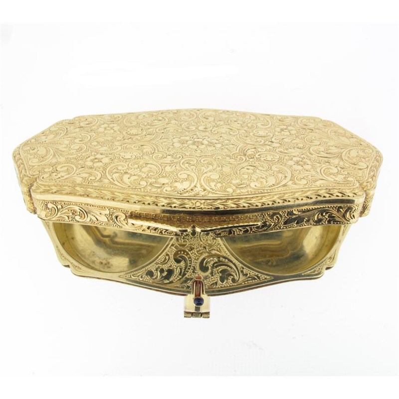 A gold menaudiere. The shaped oval box with removing lipstick holder and mirror inside the hinged cover. Foliate scroll engraving. 99g in total (including mirror and lipstick). 8.7cm wide.