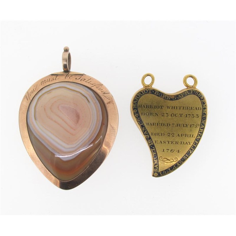 A George III pear shaped locket pendant. Engraved 'you must be satisfied' containing banded agate to one side and plaited hair to the other. 5cm high. And an unusual gold witches heart shaped mourning pendant. The front section containing hair (missing glass) . With enamel mourning assorted inscriptions to the reverse. 3.5cm high.