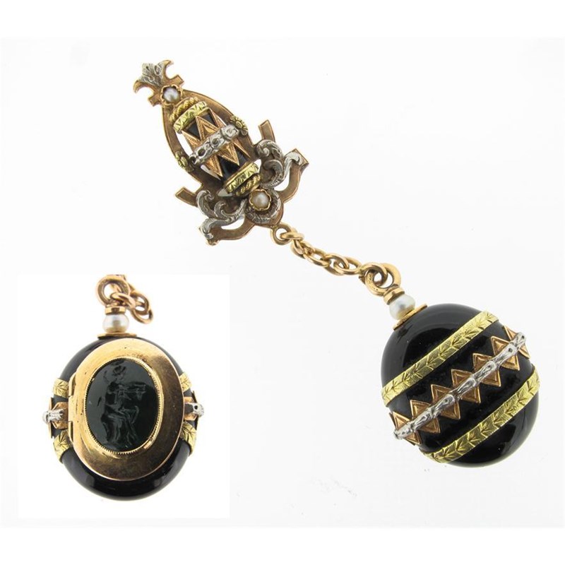 A 19th Century black enamel fob pendant with three colour gold decoration, mounted with an intaglio.