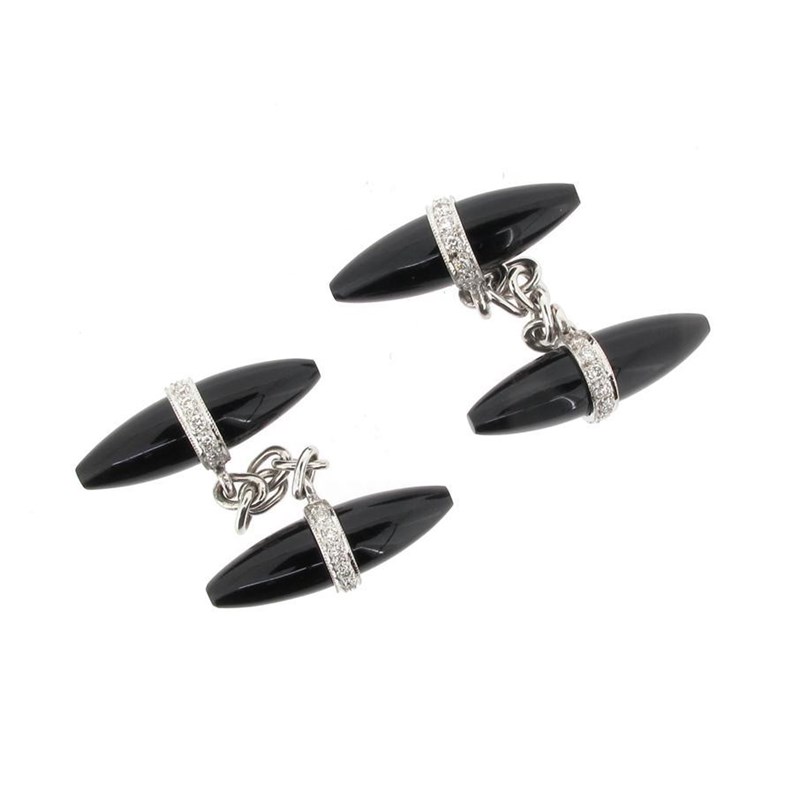 A pair of black onyx and diamond cuff links. The torpedo form links with white gold diamond set bands.