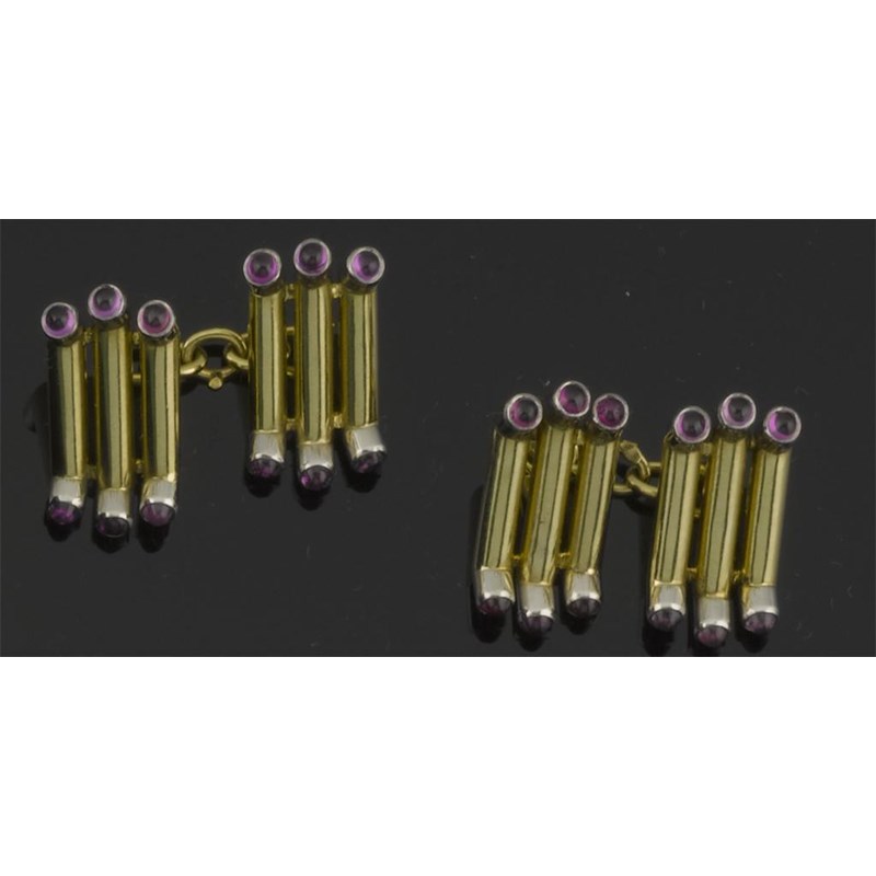 A pair of three bar cuff links. Each bar with a cabochon ruby terminal and set in yellow and white gold.