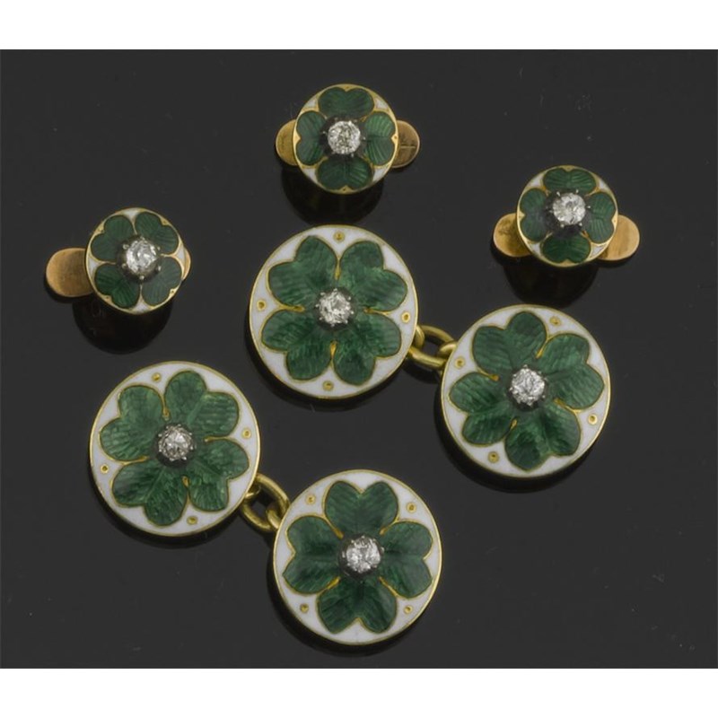 A pair of cuff links with three matching dress studs. All set with a diamond on enamel ground designed as shamrocks. 18ct gold. With a fitted cases.