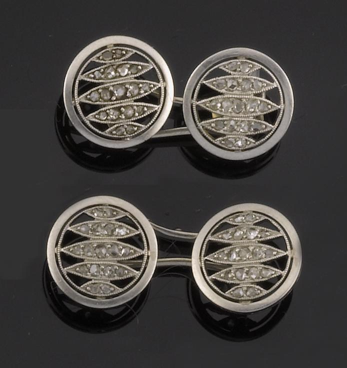 A pair of diamond set dress cuff links. Each circular disc is set with rose cut diamonds in platinum and gold. 1.0cm wide.