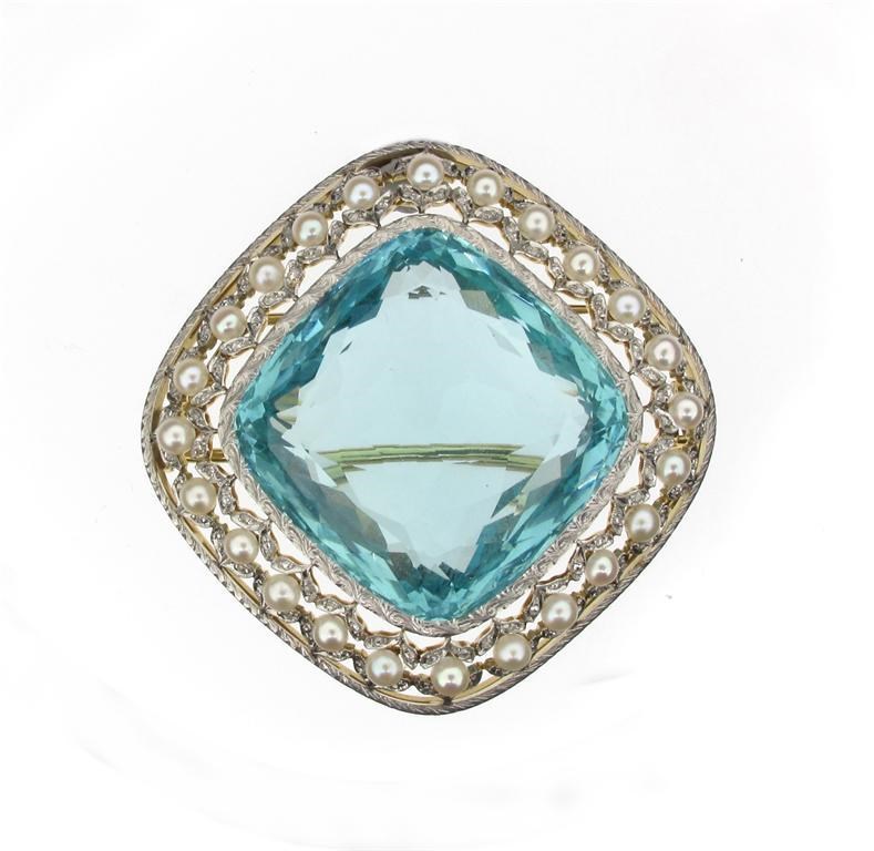 An aquamarine seed pearl and diamond brooch. The square form aquamarine weighs approximately 50.00 carats and is set in gold.