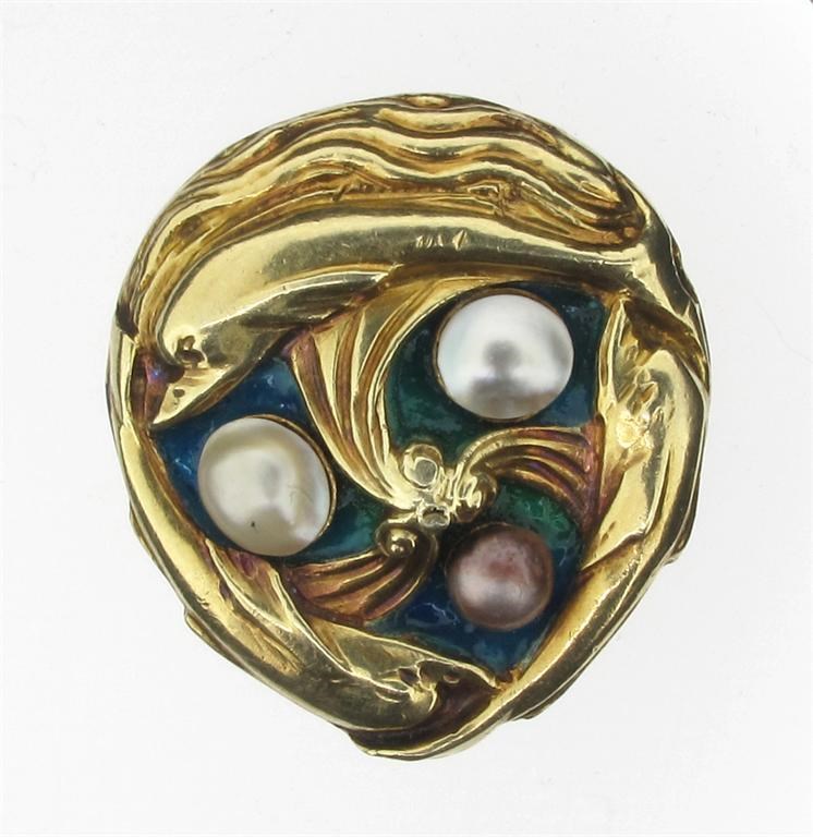 An Arts and Crafts brooch in the style of Henry Wilson. Formed as three dolphins and mounted with three pearls to the green enamel ground. 3cm high.