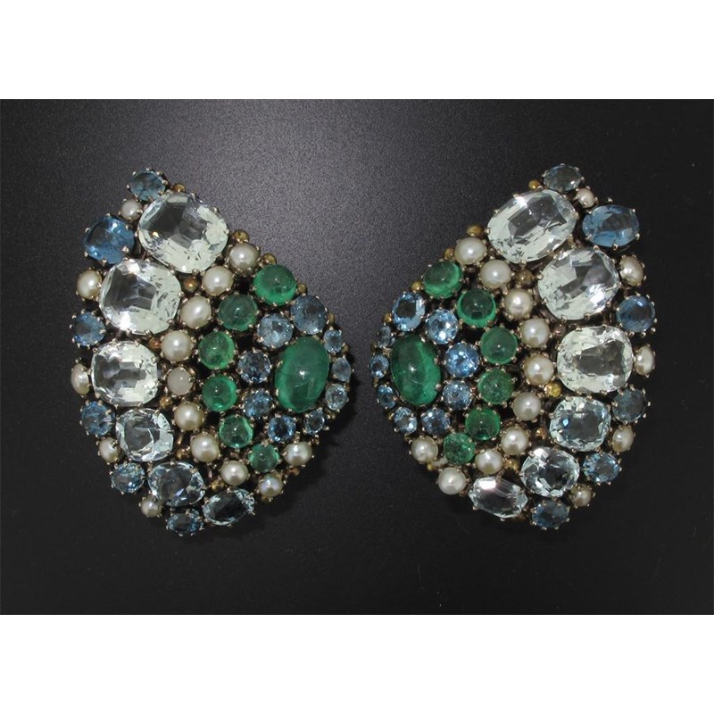 A pair of Arts and Crafts brooches in the style of Dorrie Nossiter. The fan shaped brooches are set with lines of cabochon emeralds, half pearls, and larger aquamarines in silver. One brooch missing catch. 4.5cm wide.