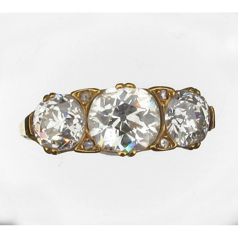 A diamond three stone ring. Set in gold, with three slightly oval shaped old cut diamonds with four rose cut diamonds and carved shoulders. Size M 1/2.
