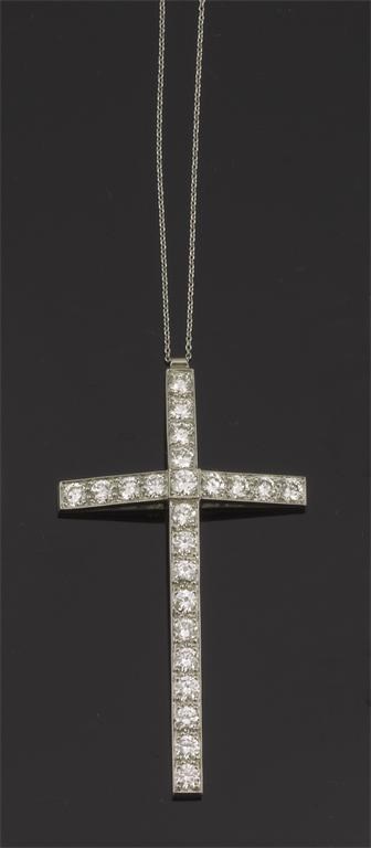 A diamond cross pendant. The brilliant cut diamonds are set in white gold. 5cm high. On a fine link white gold neck chain.