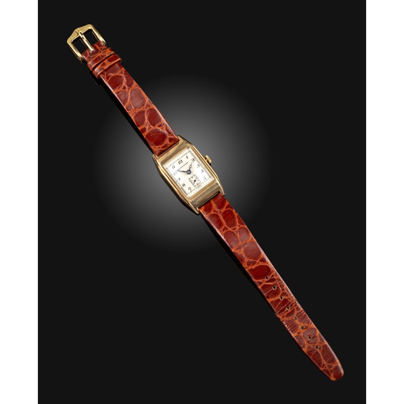 A gentleman's gold wristwatch by Longines, the signed rectangular dial with black Arabic numerals and subsidiary seconds dial, manual movement, inscription to reverse dated 1937, numbered 5297007, case 21mm, unsigned leather strap
