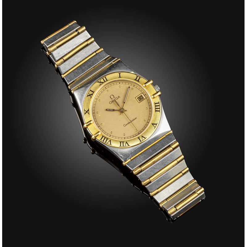 A steel and gold Constellation wristwatch by Omega, the signed dial with date aperture at 3 and sweep seconds hand, gold chapter ring with Roman numerals, name and date engraved on the reverse, on gold Omega band with deployant clasp, case 3.2cm wide