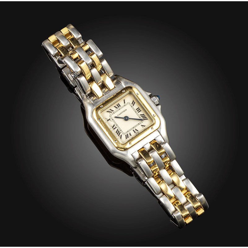 A lady's Panthere steel and gold wristwatch by Cartier, the signed dial with black Roman numerals, case 22mm, deployant clasp, quartz movement, box and papers
