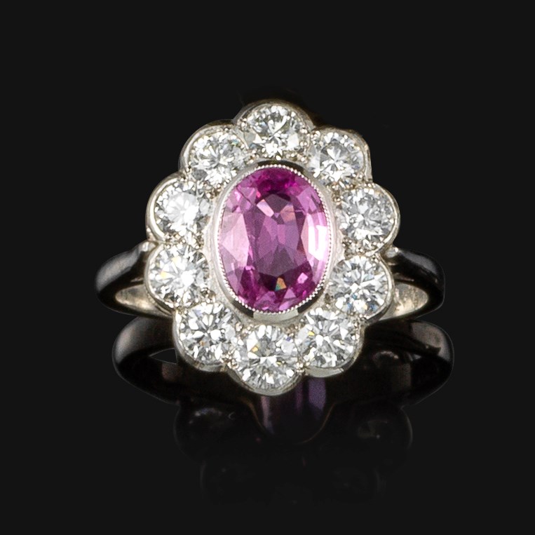 A pink sapphire and diamond cluster ring, the oval-shaped pink sapphire is set within a surround of round brilliant-cut diamonds in platinum, size N