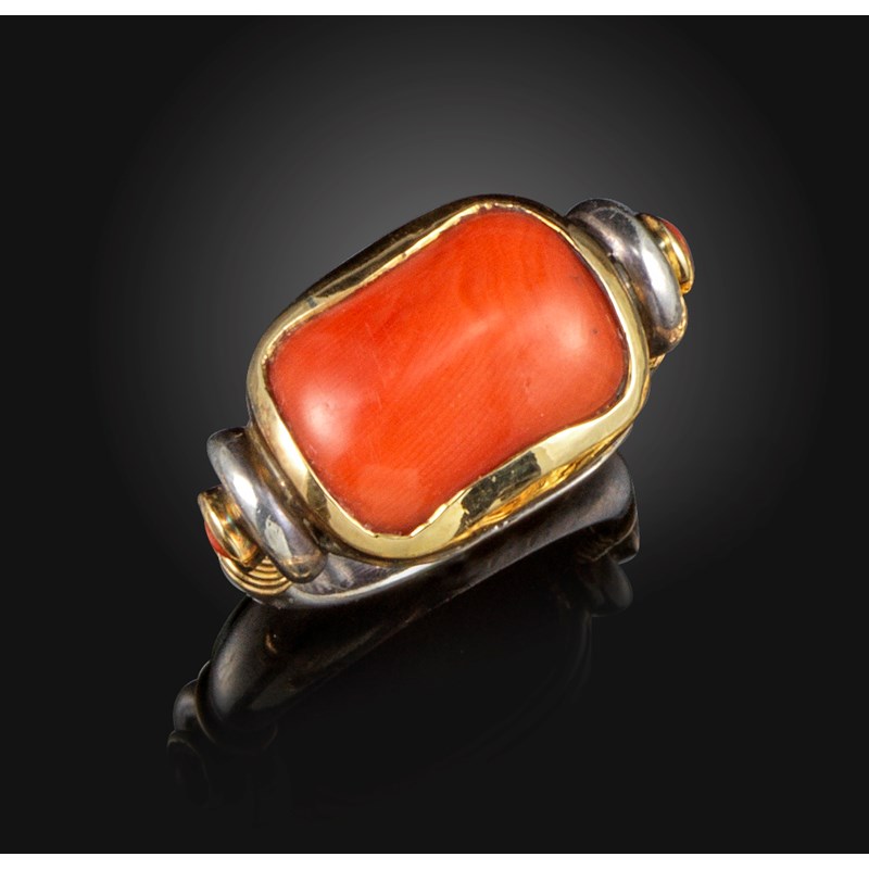 A coral-set silver and gold ring, centred with a rectangular coral cabochon, with further coral cabochons to the shoulders in silver and gold, unidentified marks to the shank, size O 1/2 (approximately)