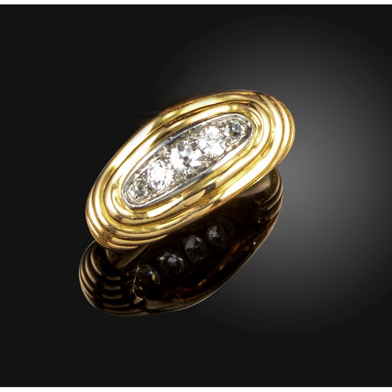 A diamond dress ring, set with five graduated old circular cut diamonds in platinum, in fluted yellow gold mount, size K