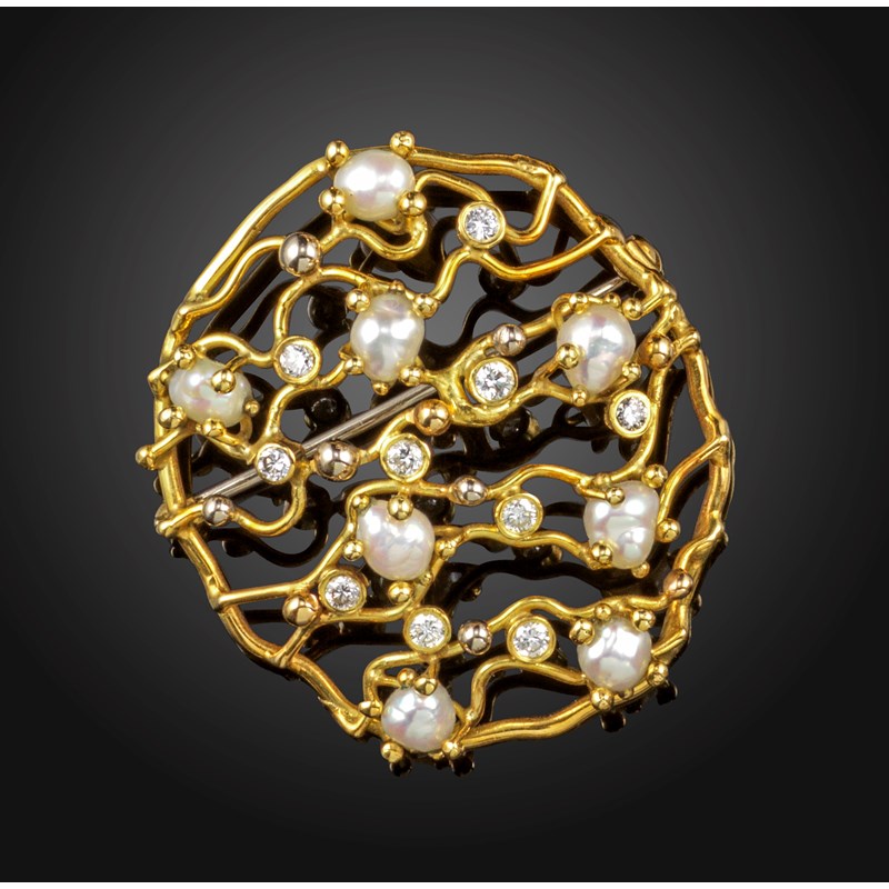 An 18ct gold tendril form open brooch by Martin White, set overall with cultured pearls and circular-cut diamonds, maker's mark and London marks for 1991, 3.7cm wide, case