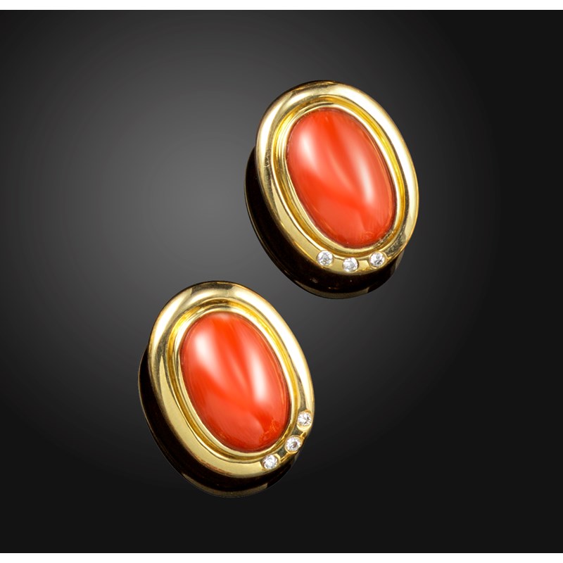 A pair of coral and diamond-set gold earrings