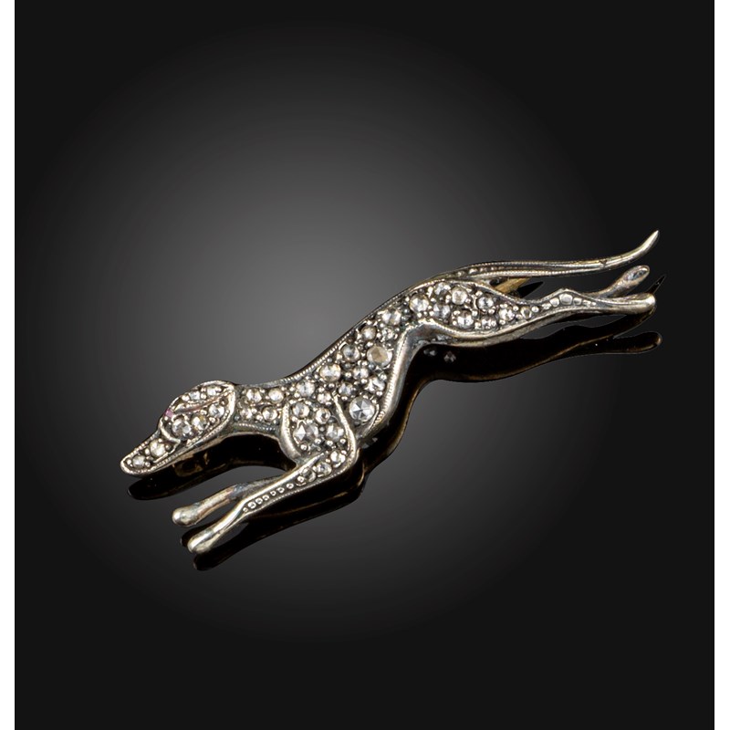A diamond-set greyhound brooch, pave-set overall with rose-cut diamonds in silver and gold, 4.5cm long