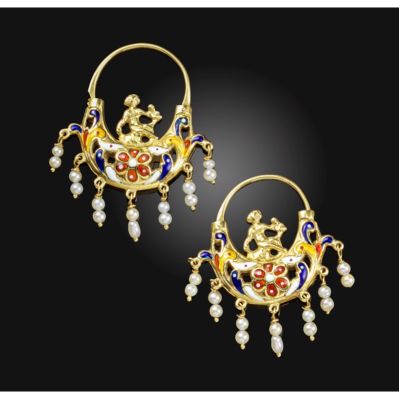 A pair of enamel and gold earrings, designed as stylised putti riding polychrome enamel gondolas suspending cultured pearls in yellow gold, 4.4cm high