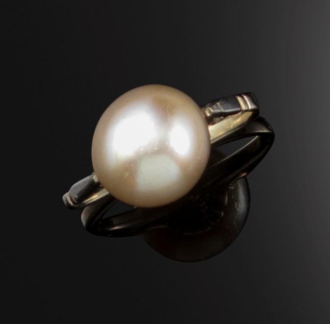 A natural pearl solitaire ring, the button-shaped pearl set in plain white gold mount, size K 1/2